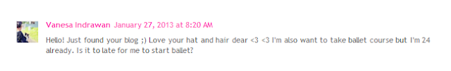 Hi dear! thanks for dropping by my blog! Actually, 24 is very late to start taking ballet lessons unless you tried gymnastics / taekwondo / figure skating/ etc.. It is very advisable to start learning ballet at a young age (I started at the age of 4). It's because ballet is a form of dance wherein one's body needs to be disciplined and be molded into what people see on stage. But you know what, if you're really willing to learn, then I suggest you give it a go even if your ballet mates would be younger than you. Try inquiring at ballet schools. Good Luck! Let me know how it will turn out =))